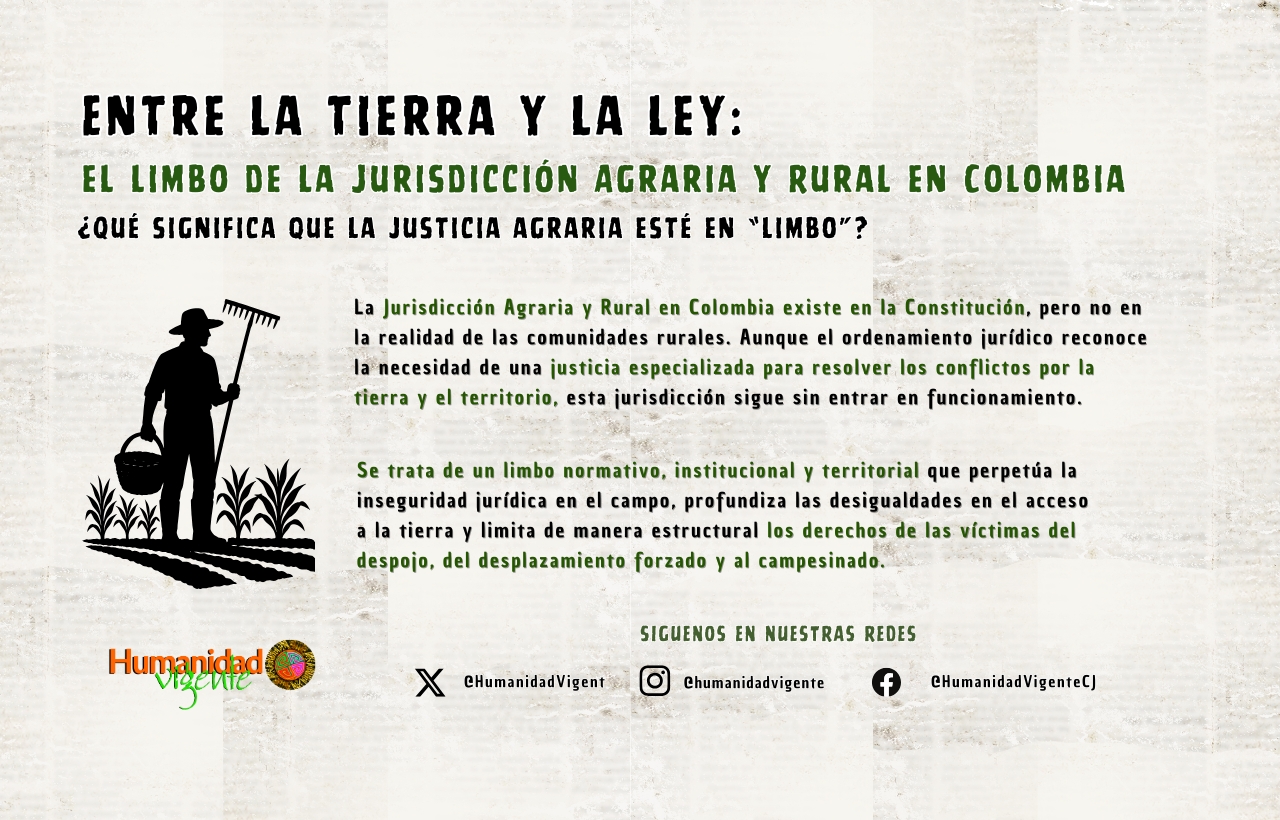 Entre la tierra y la ley el limbo de la Jurisdicción Agraria y Rural en Colombia – Sitio Web Escrito por Humanidad Vigente el 5 febrero, 2026|| No hay comentarios Dejar un comentario Su opinión es muy importante para nosotros, su correo electrónico no será reveladoClick here to cancel reply Save my name, email, and website in this browser for the next time I comment. Enviar comentario Δ